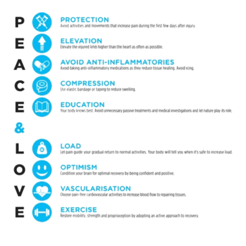 Here’s a breakdown of what PEACE & LOVE stands for, and how you can use it to manage acute injuries: